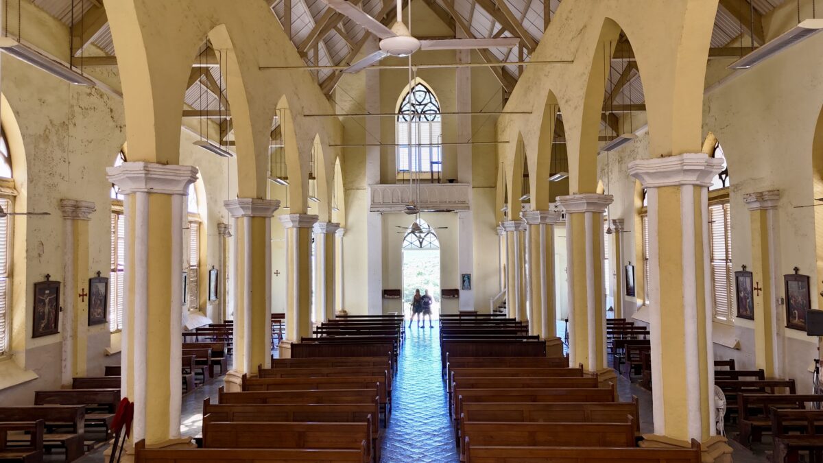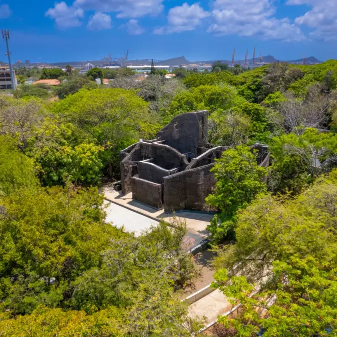 A Catedral de Espinhos é uma instalação artística impressionante criada pelo artista Herman van Bergen, feita com milhares de espinhos da planta Acacia tortuosa, conhecida localmente como sumpiña. Muito comum na paisagem árida de Curaçao, essa planta simboliza resistência e sobrevivência em um ambiente difícil. A obra também faz referência à história da ilha, especialmente à quase extinção das árvores Wayaká após a colonização europeia.