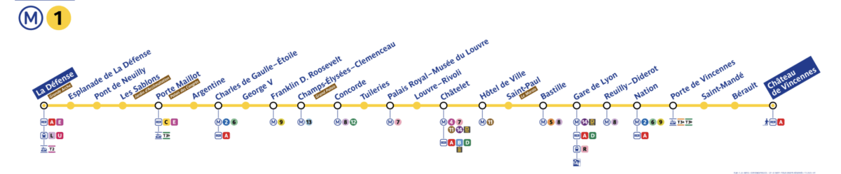 Exemplo prático: você está na estação Charles de Gaulle – Étoile e quer ir ao Louvre usando a linha 1. Ao entrar na estação, deve seguir as placas no sentido Château de Vincennes, que é a estação final daquele lado da linha. A estação onde você vai descer é Palais Royal – Musée du Louvre, mas o que orienta o trajeto é o nome da estação final.