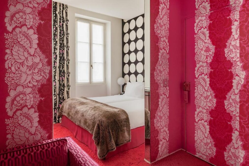 O Hôtel du Petit Moulin é um boutique hotel decorado por Christian Lacroix, o que já entrega uma experiência diferente do padrão tradicional parisiense. Cada quarto é único, com ar-condicionado, TV de tela plana, frigobar, cofre e banheiro privativo com roupão.