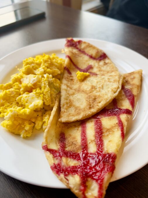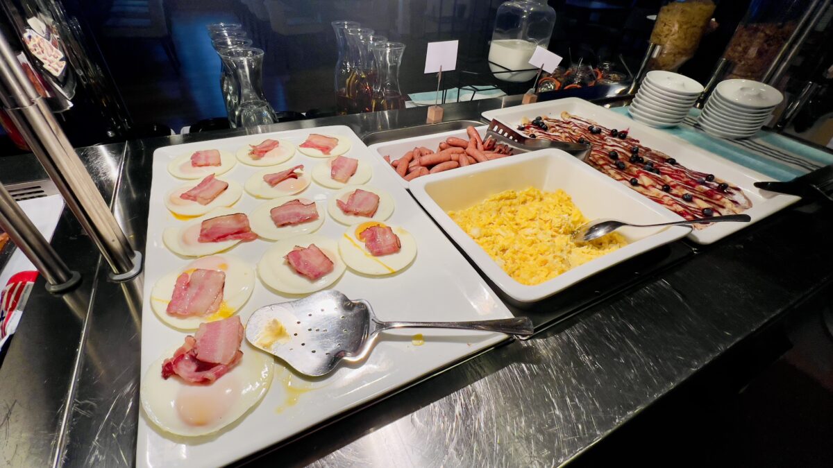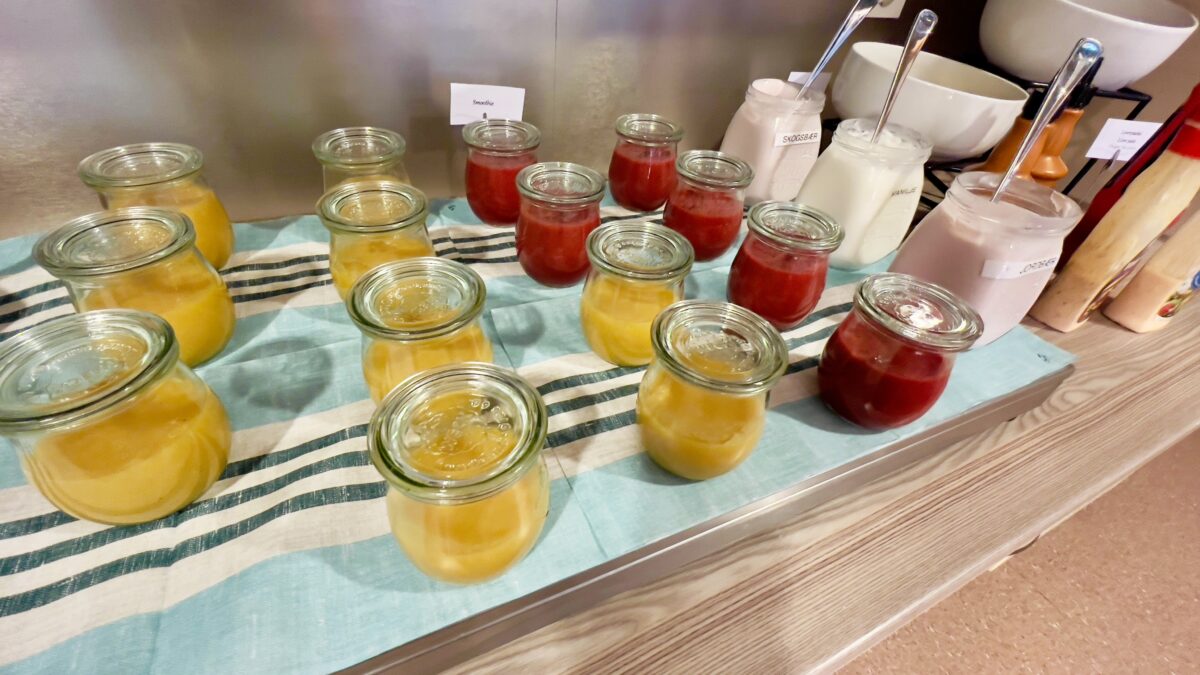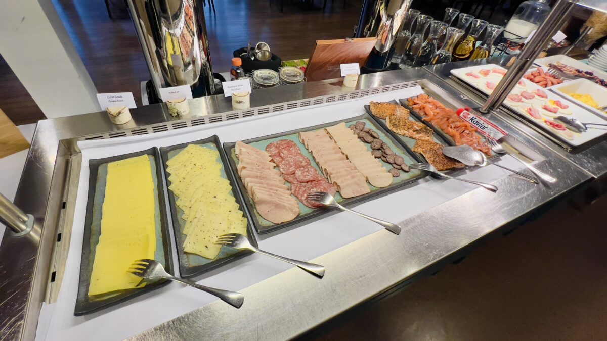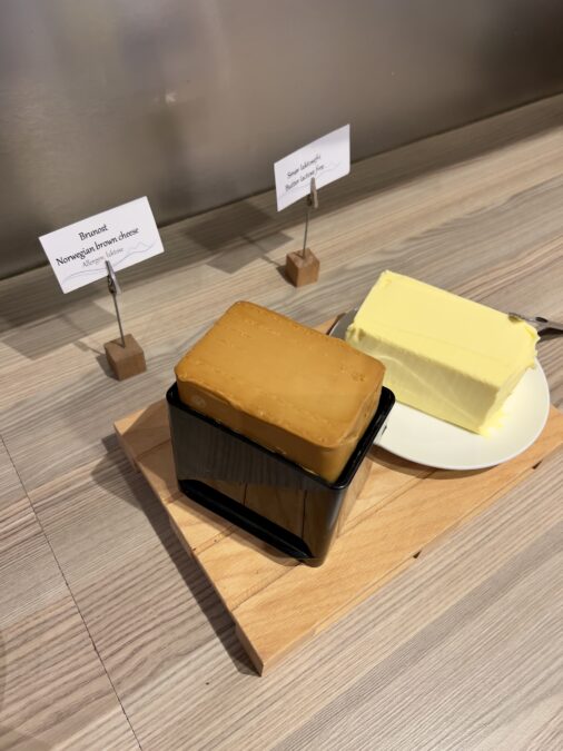 O buffet segue o padrão generoso dos hotéis escandinavos e oferece uma boa variedade de pães, queijos, frios, ovos, frutas, iogurte, cereais e sucos, além de café e chá. Um destaque especial é o queijo marrom norueguês (brunost), uma das especialidades mais tradicionais do país, com sabor levemente adocicado e textura cremosa.