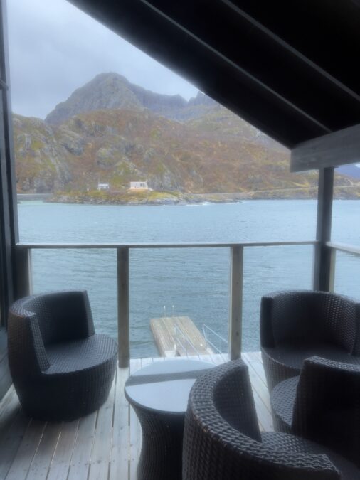 Um dos destaques é o deck externo voltado para o mar, de onde é possível observar o fiorde, as montanhas e, em noites favoráveis, a aurora boreal. É um espaço tranquilo, perfeito para simplesmente sentar, respirar o ar frio do Ártico e contemplar a paisagem.