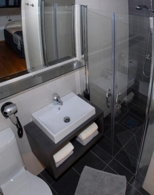 O banheiro é moderno e bem equipado, com ducha quente, secador de cabelo, toalhas confortáveis e amenities básicos. No conjunto, a sensação é de estar em um pequeno refúgio no Ártico — confortável, silencioso e completamente integrado à natureza ao redor.