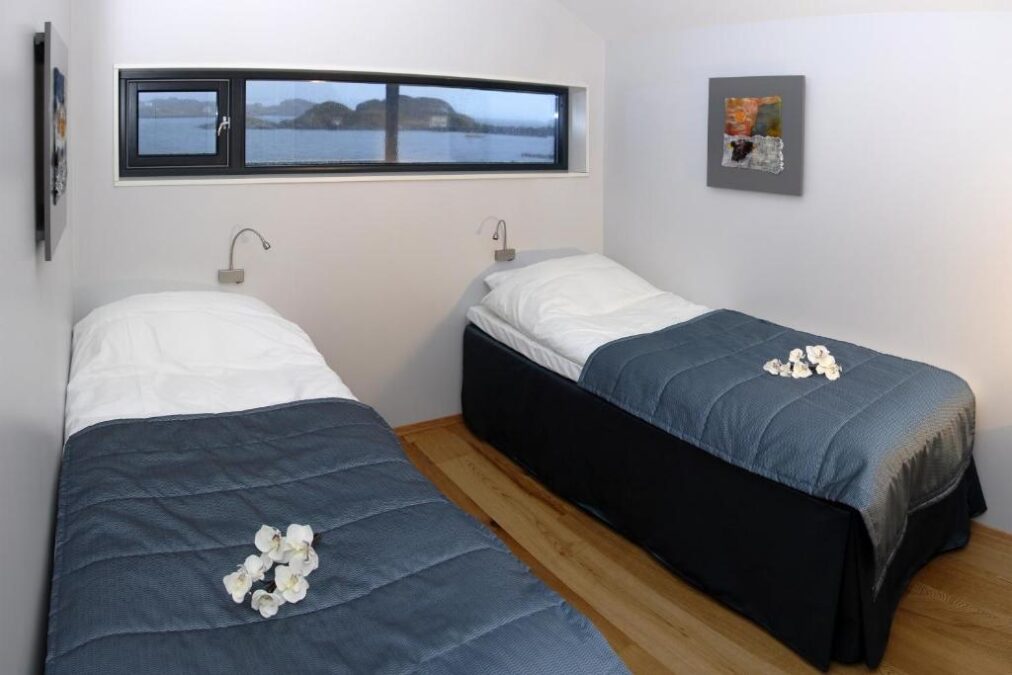 A decoração segue o estilo escandinavo clássico: simples, funcional e aconchegante, com bastante madeira e tons claros. Muitos apartamentos têm janelas amplas voltadas para o mar e para os fiordes, o que transforma a paisagem em parte da experiência da hospedagem. É aquele tipo de lugar em que você acorda, abre a cortina e precisa de alguns minutos apenas para observar o cenário lá fora.