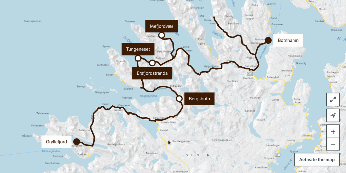 Um dos grandes destaques da ilha é a National Scenic Route Senja, uma das rotas cênicas oficiais da Noruega. Esse rota percorre áreas de fiordes, montanhas e vilarejos de pescadores, com vários pontos de parada projetados para observar a paisagem.