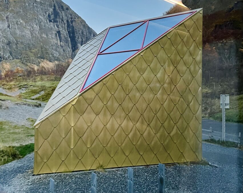 Ali também fica o famoso Gulldassen, o “banheiro dourado”, uma pequena construção metálica instalada na praia como parte do projeto da rota cênica da Noruega. Pode parecer curioso, mas acabou virando um dos pontos mais fotografados da ilha.