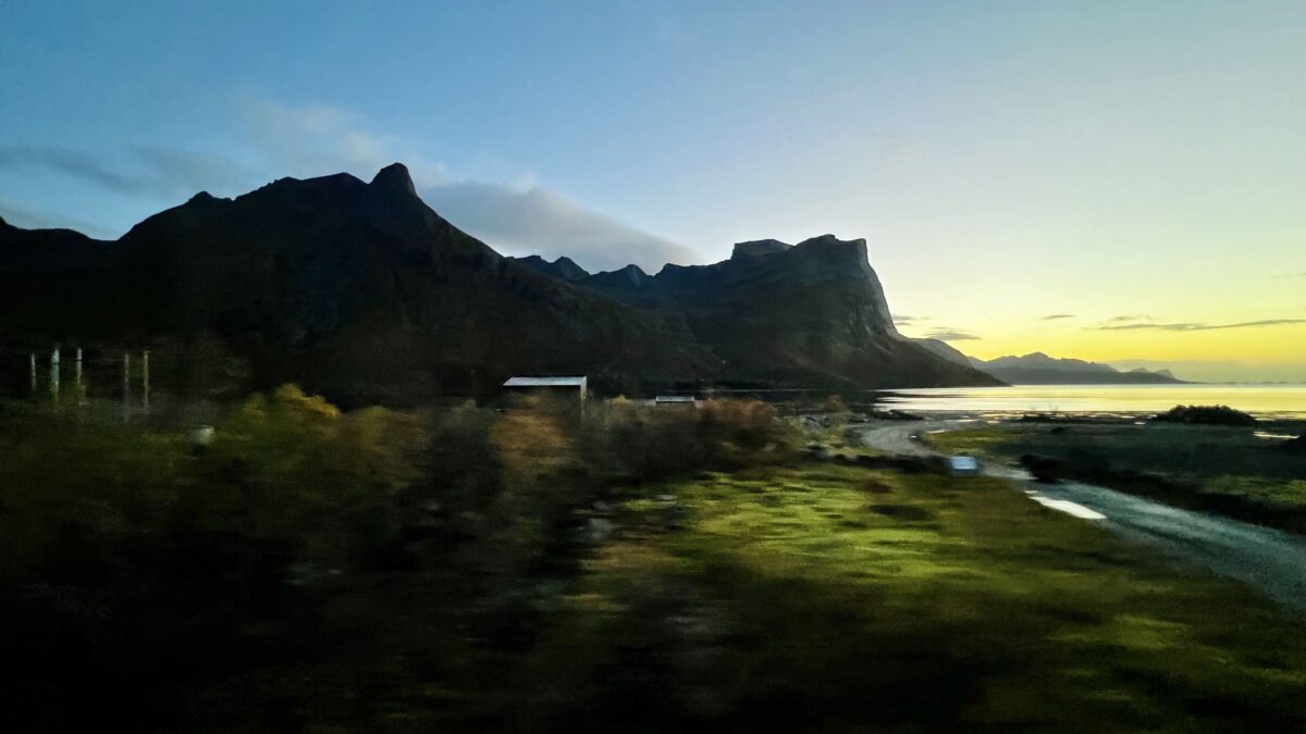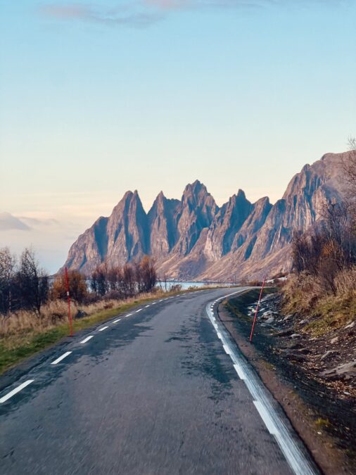 Ao dirigir por esse trecho, a sensação é de que a paisagem muda o tempo todo. Em poucos quilômetros você passa por fiordes, montanhas que parecem surgir diretamente do mar e pequenas vilas de pescadores espalhadas pela costa.