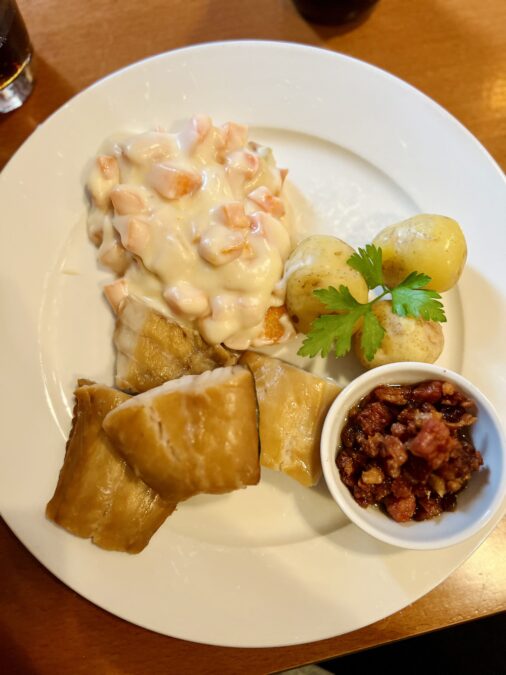 Na hora do almoço fomos ao Senjastua, um restaurante bastante conhecido por ali e que trabalha muito com ingredientes locais. Pedi um prato de cod fish, um dos peixes mais tradicionais da culinária norueguesa, preparado de forma simples e muito saborosa. O restaurante tem um ambiente bem acolhedor e é daqueles lugares que mostram um pouco da gastronomia típica do norte da Noruega.