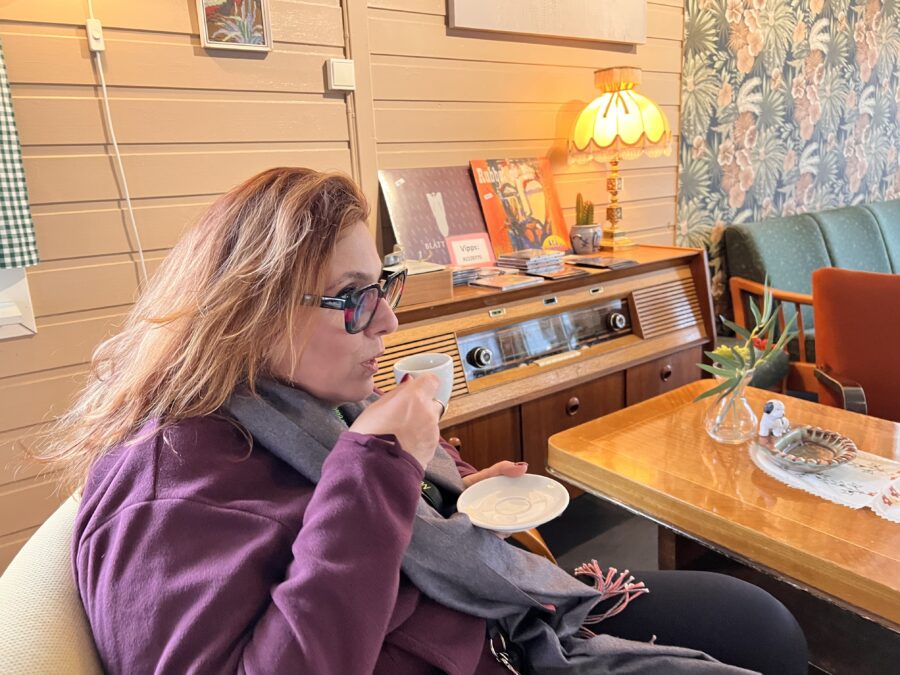 Também paramos para um café no Fruene Kaffe Og Vinbar, um lugar super agradável, com clima bem aconchegante — perfeito para aquecer um pouco do frio típico da região.