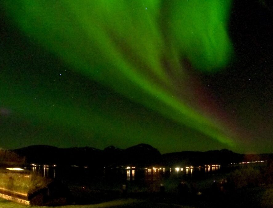 - Região dos hotéis voltados para o fiorde: hospedagens como o Hotel Fjellkysten ficam em posição privilegiada, com vista direta para o céu sobre o fiorde. Foi exatamente essa a minha experiência: a aurora apareceu forte, linda, refletindo na água, sem que precisássemos sair de carro ou dirigir para mirantes específicos. O hotel tinha drinks e ficamos no gramado, bebendo e celebrando a dama da noite.