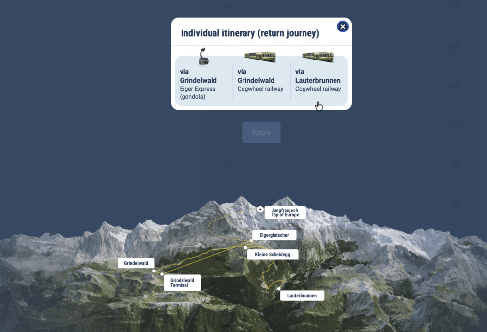 Ao acessar o site da Jungfrau, você poderá escolher a data do passeio e de onde você parte. No meu caso Interlaken Ost . Aqui você precisa prestar atencao e personalizar a sua volta, caso deseje subir por um trajeto e descer por outro. Se não ele automaticamente vai fazer a volta ao ponto de partida.