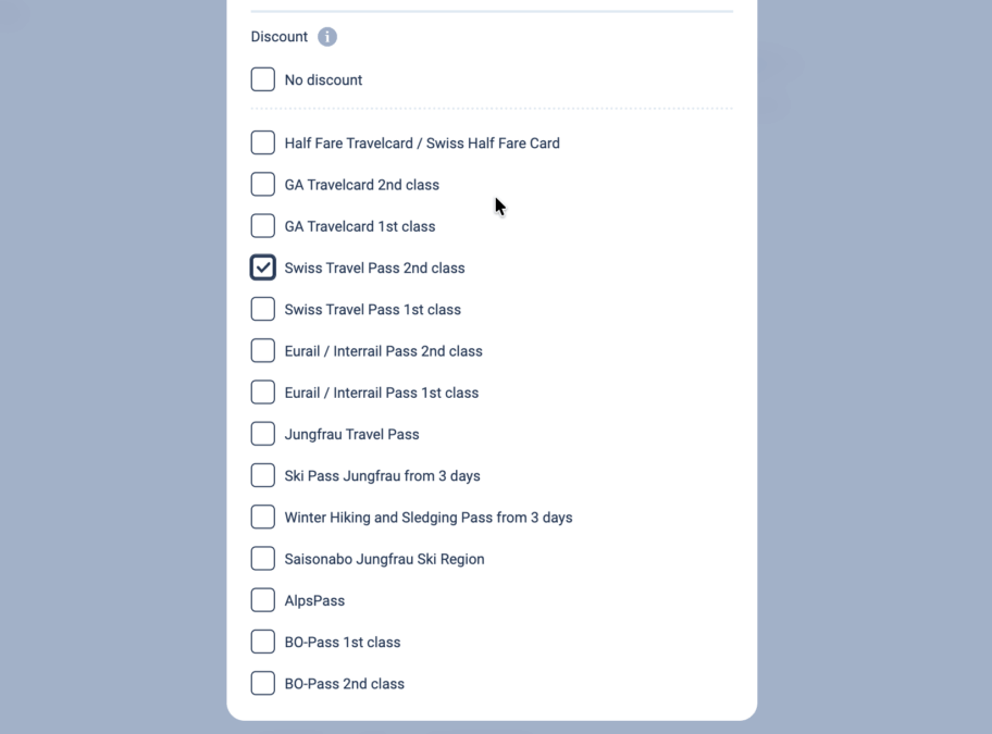 Antes de finalizar a compra vai aparecer a tela pra você escolher o tipo de desconto. No meu caso, Swiss Travel Pass, segunda classe. O sistema já aplica o desconto automaticamente.