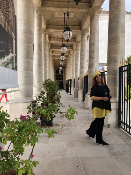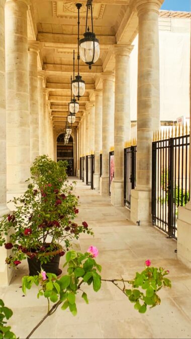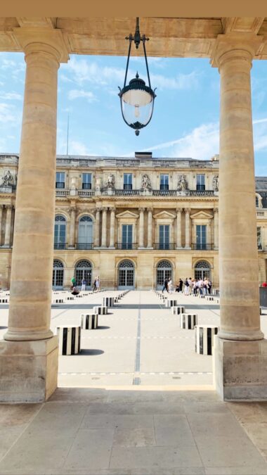 Além do jardim, o espaço ficou famoso pelas colunas listradas em preto e branco, conhecidas como Colonnes de Buren, uma instalação de arte contemporânea que virou um dos pontos mais fotografados dali. É um dos meus lugares preferidos em Paris para tomar um pouco de sol e observar o movimento com calma — algo que funciona muito bem para quem está viajando sozinha.