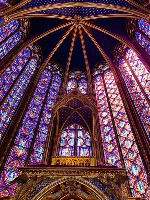 A Sainte-Chapelle é uma igreja gótica do século XIII construída para abrigar relíquias sagradas e é considerada uma das obras mais impressionantes desse estilo em Paris. O grande destaque está na estrutura vertical e nos vitrais que praticamente substituem as paredes, criando um espaço totalmente tomado por luz e cor.